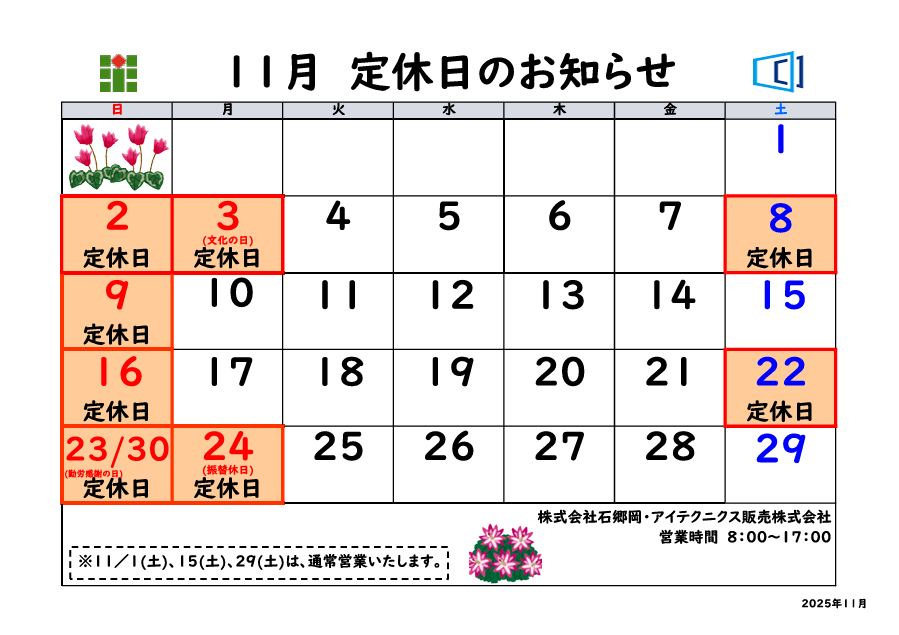 令和7年11月 定休日のお知らせ