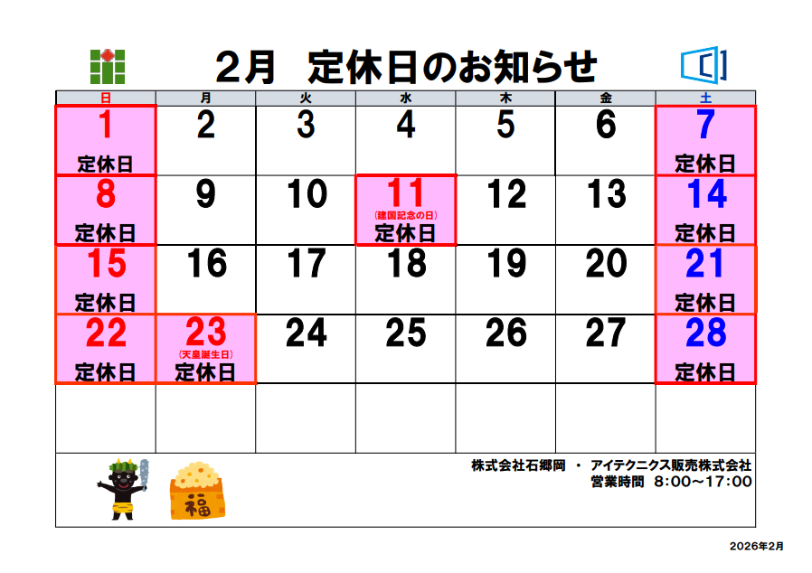 令和8年2月 定休日のお知らせ