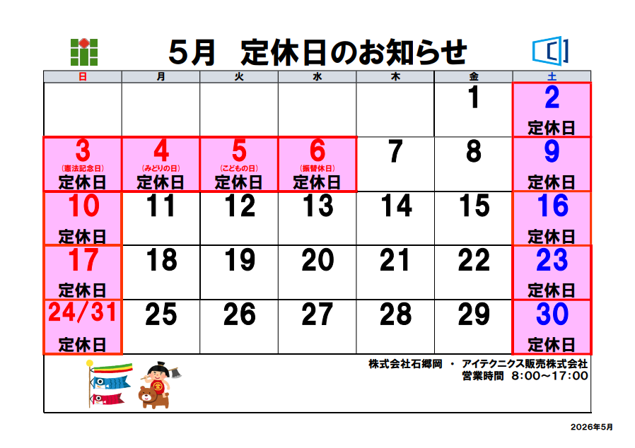 令和8年5月 定休日のお知らせ