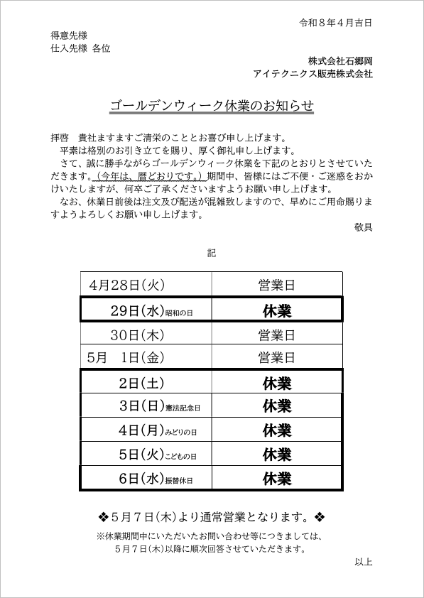 ゴールデンウィークは、暦どおりの休みになります。
